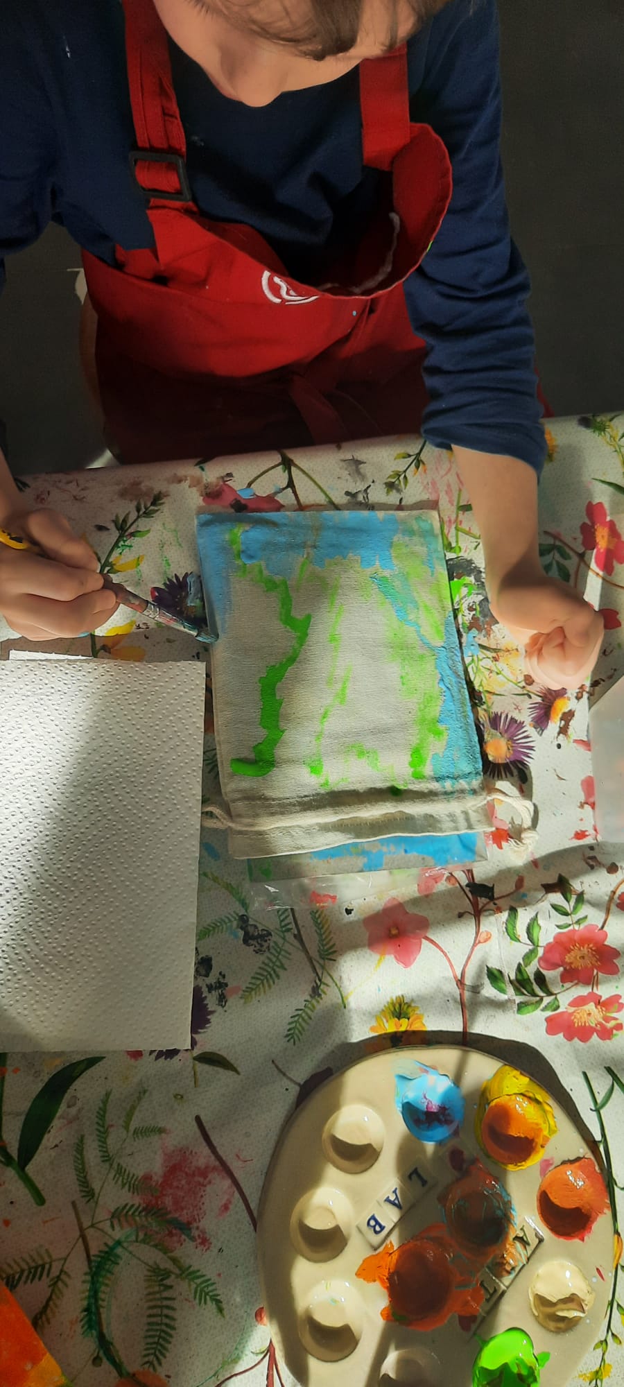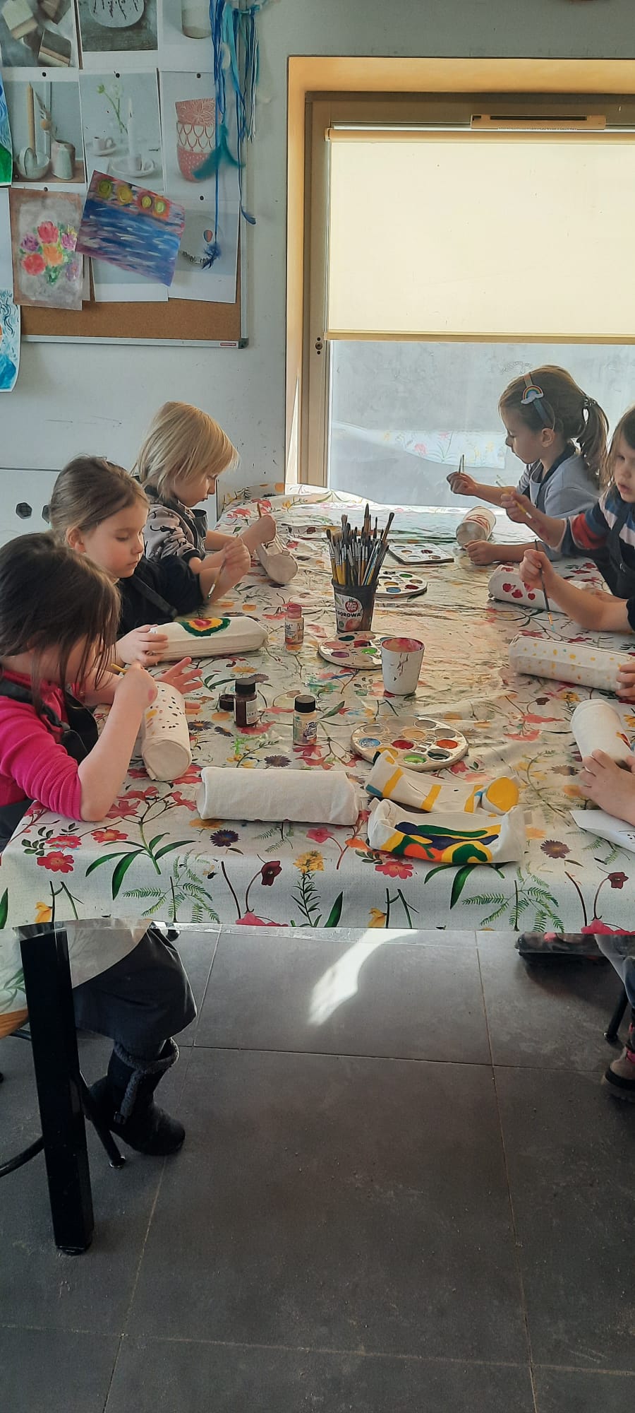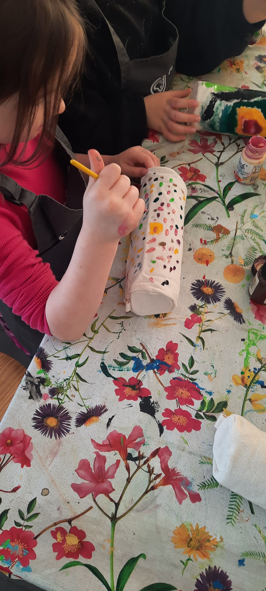 W pracowni ArtLab "Kropelki" wzięły udział w kreatywnych warsztatach plastycznych - malowanie na tkaninach. Tu właśnie powstały unikalne i niepowtarzalne woreczki oraz piórniki.