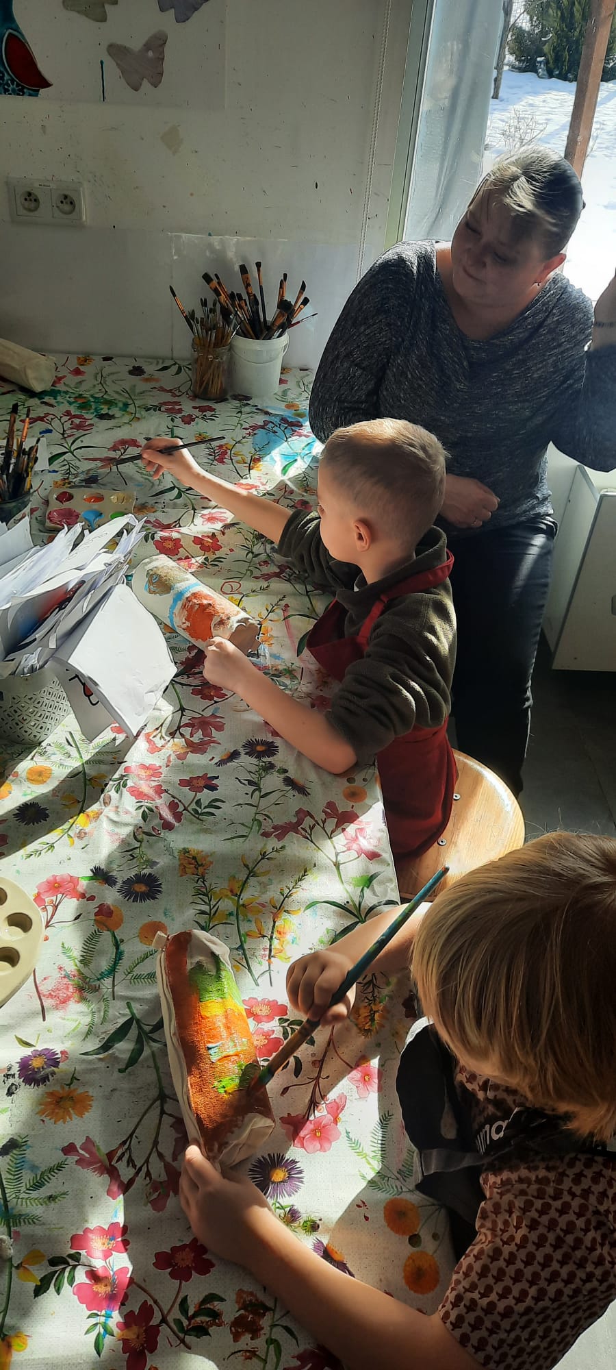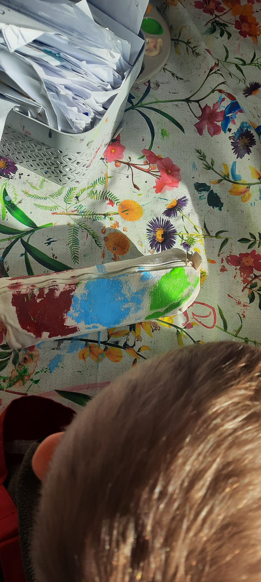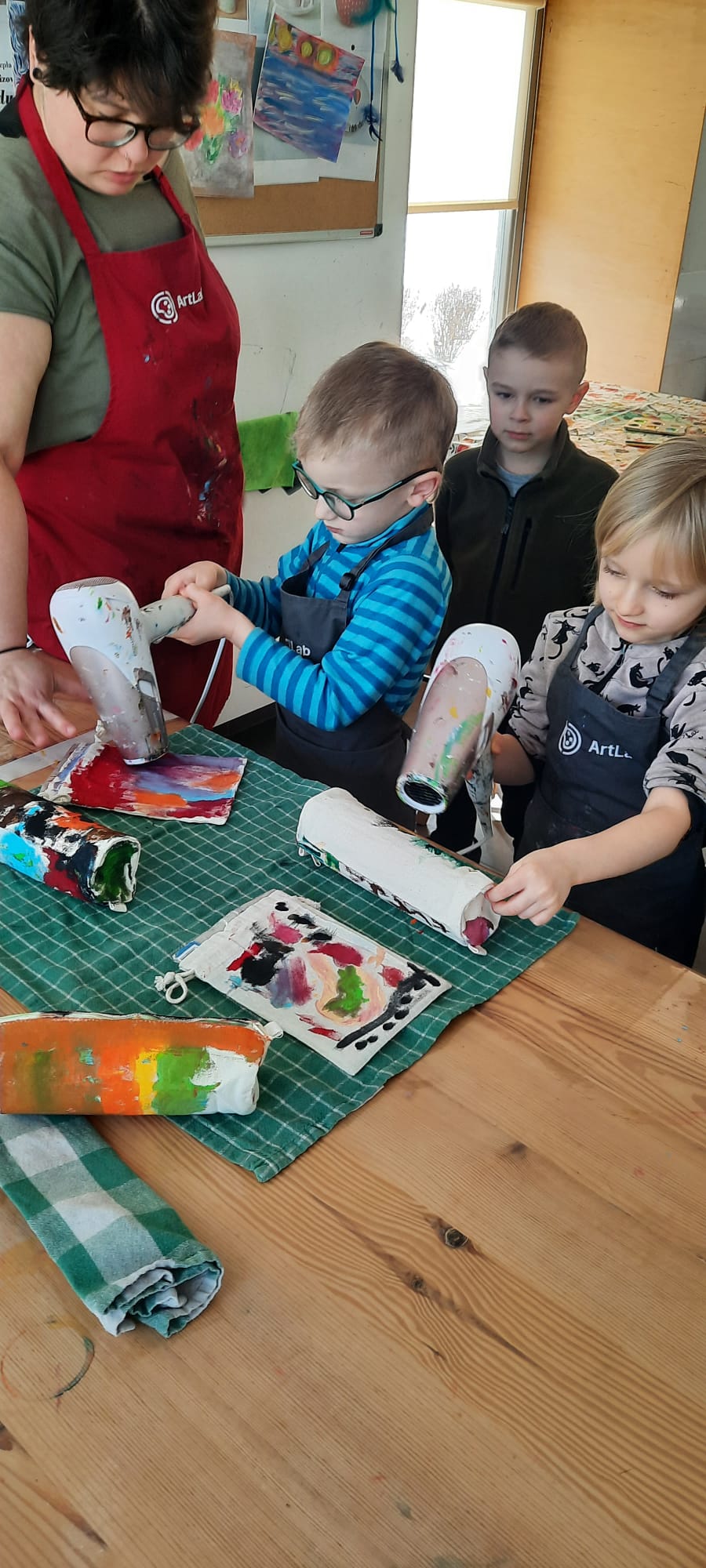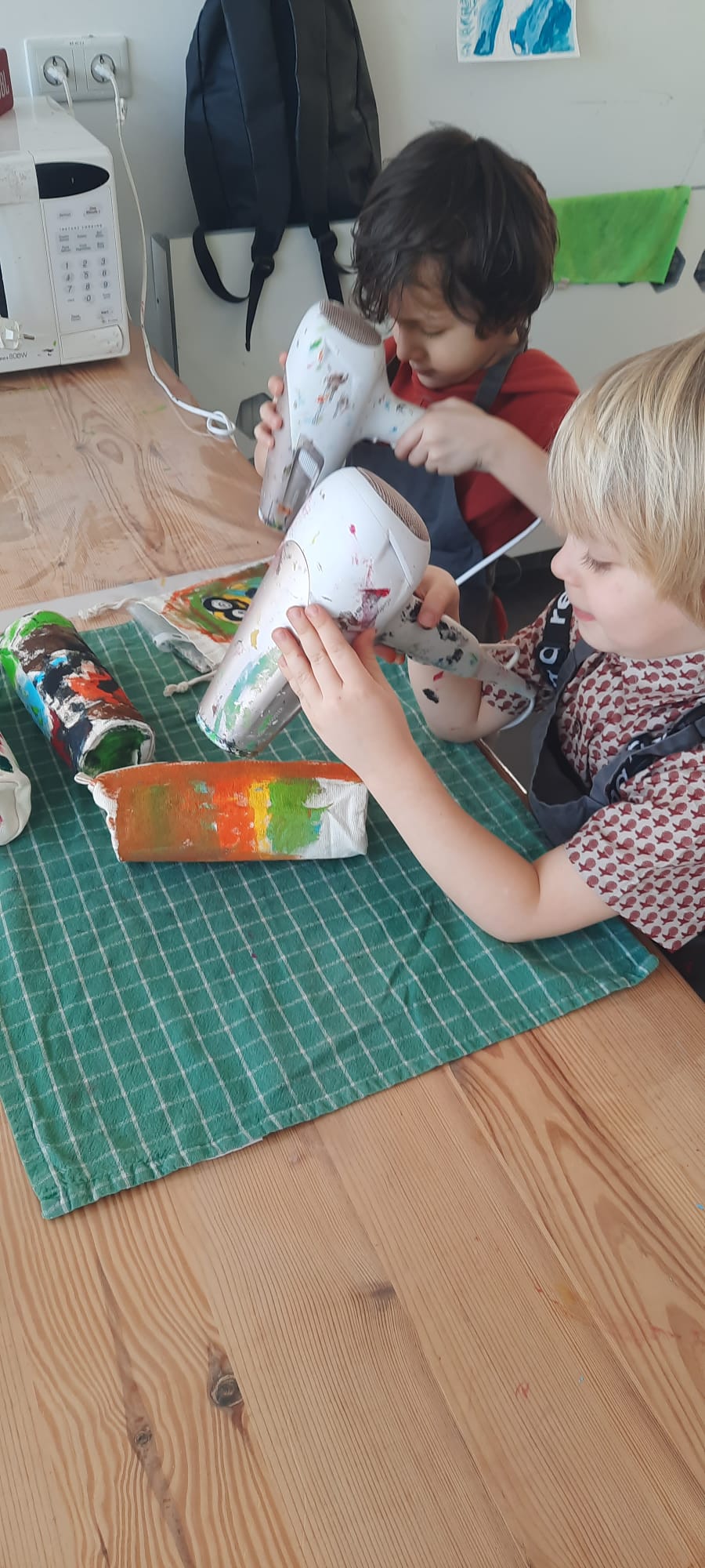 W pracowni ArtLab "Kropelki" wzięły udział w kreatywnych warsztatach plastycznych - malowanie na tkaninach. Tu właśnie powstały unikalne i niepowtarzalne woreczki oraz piórniki.