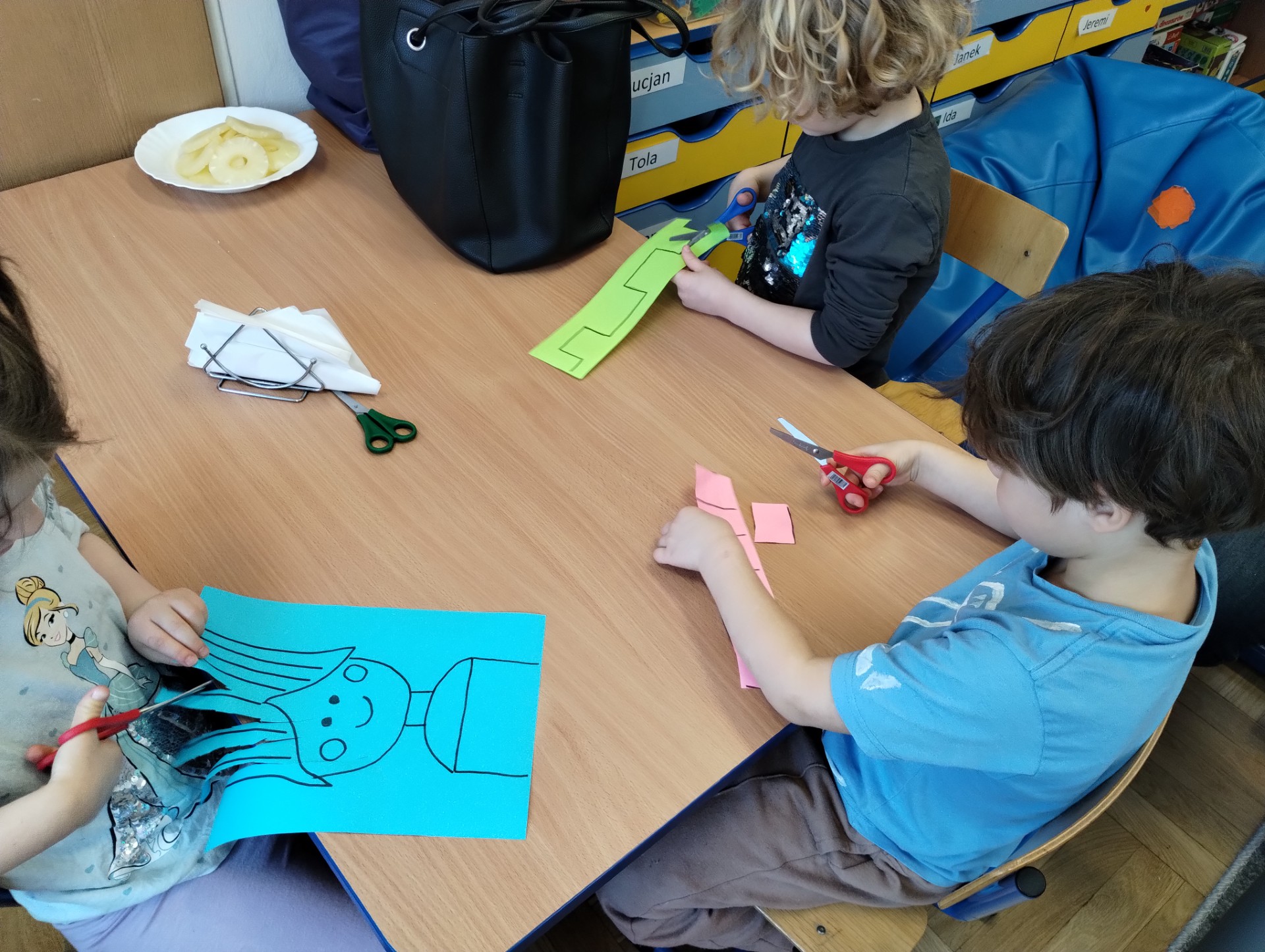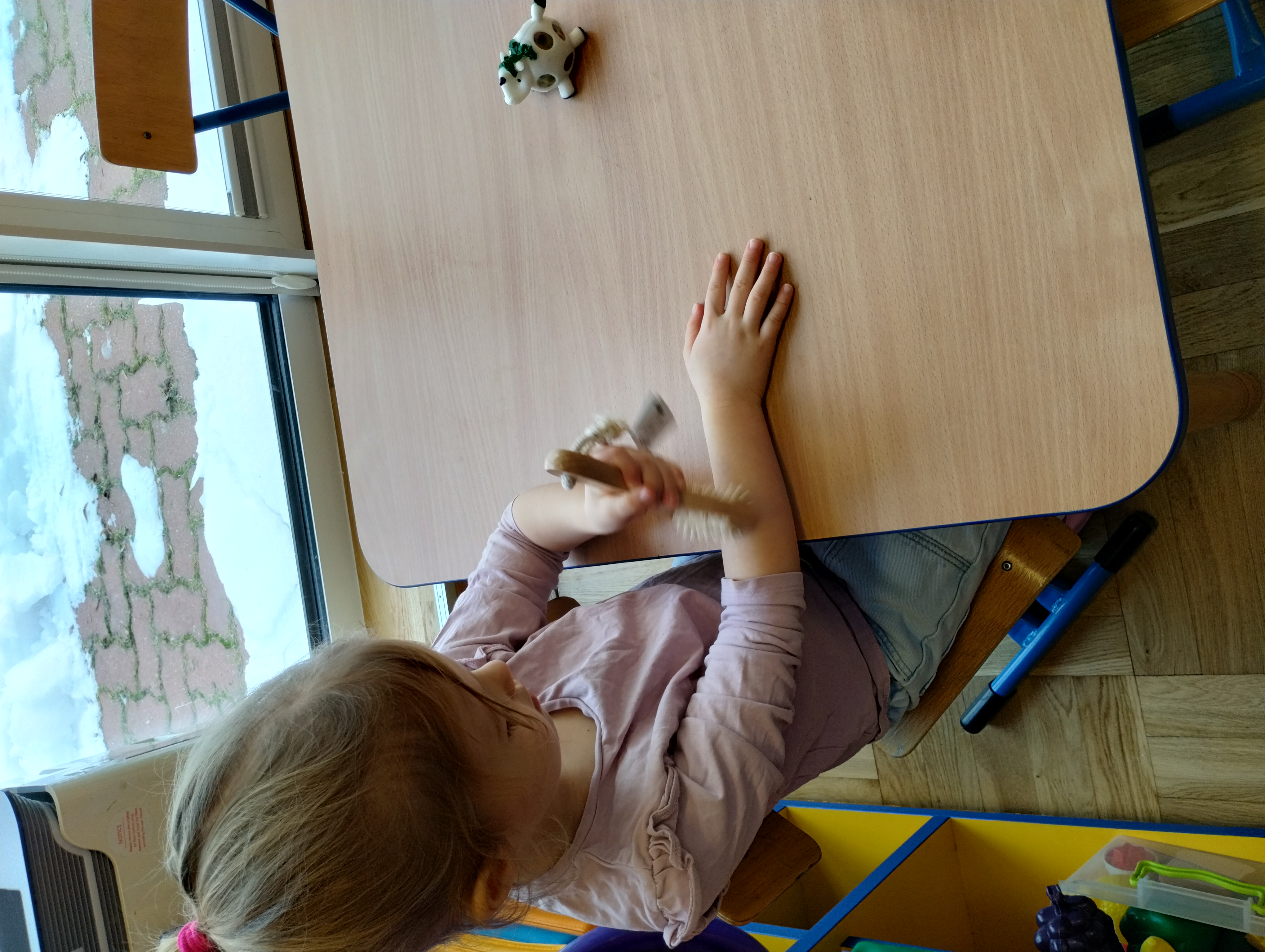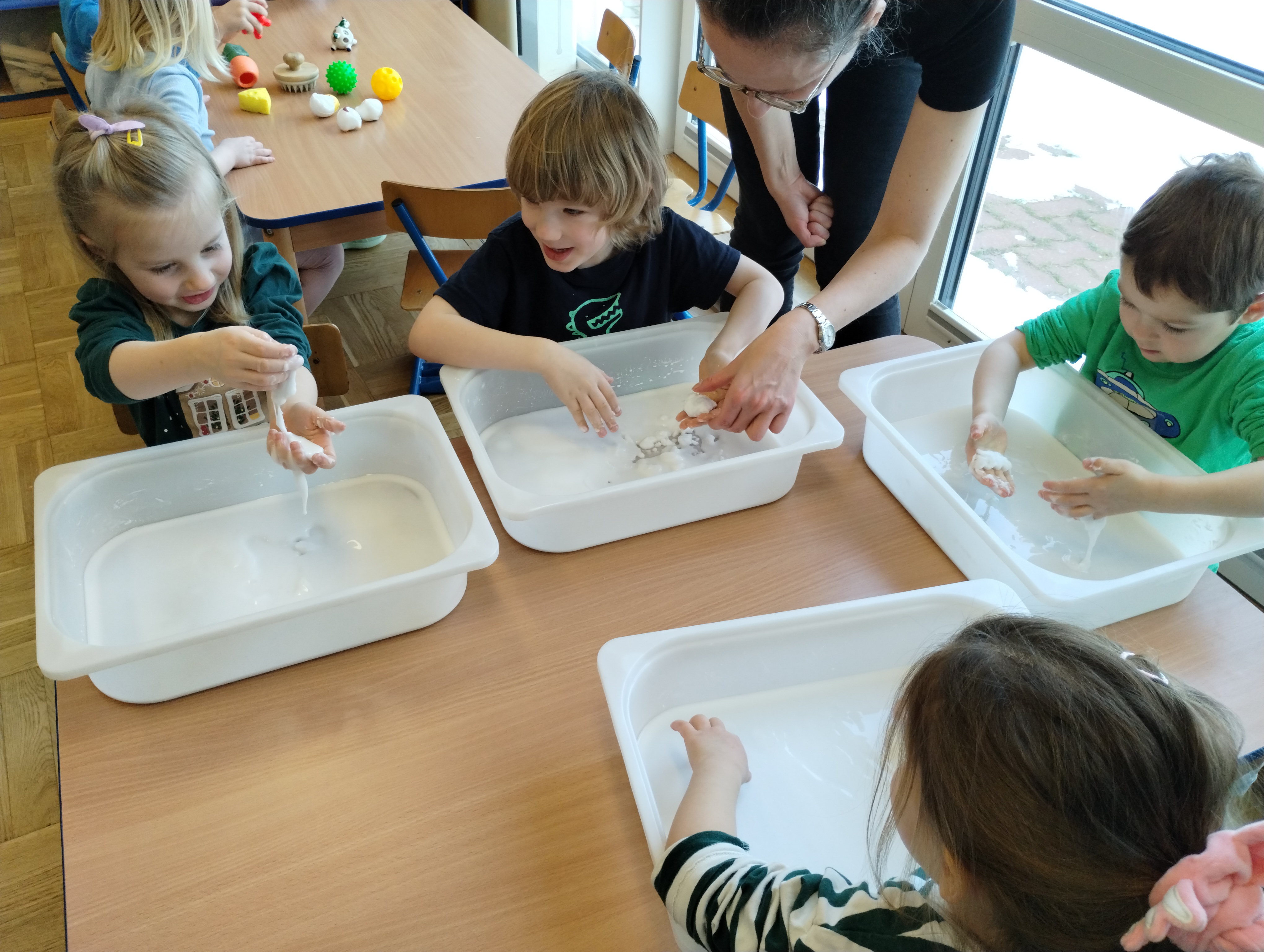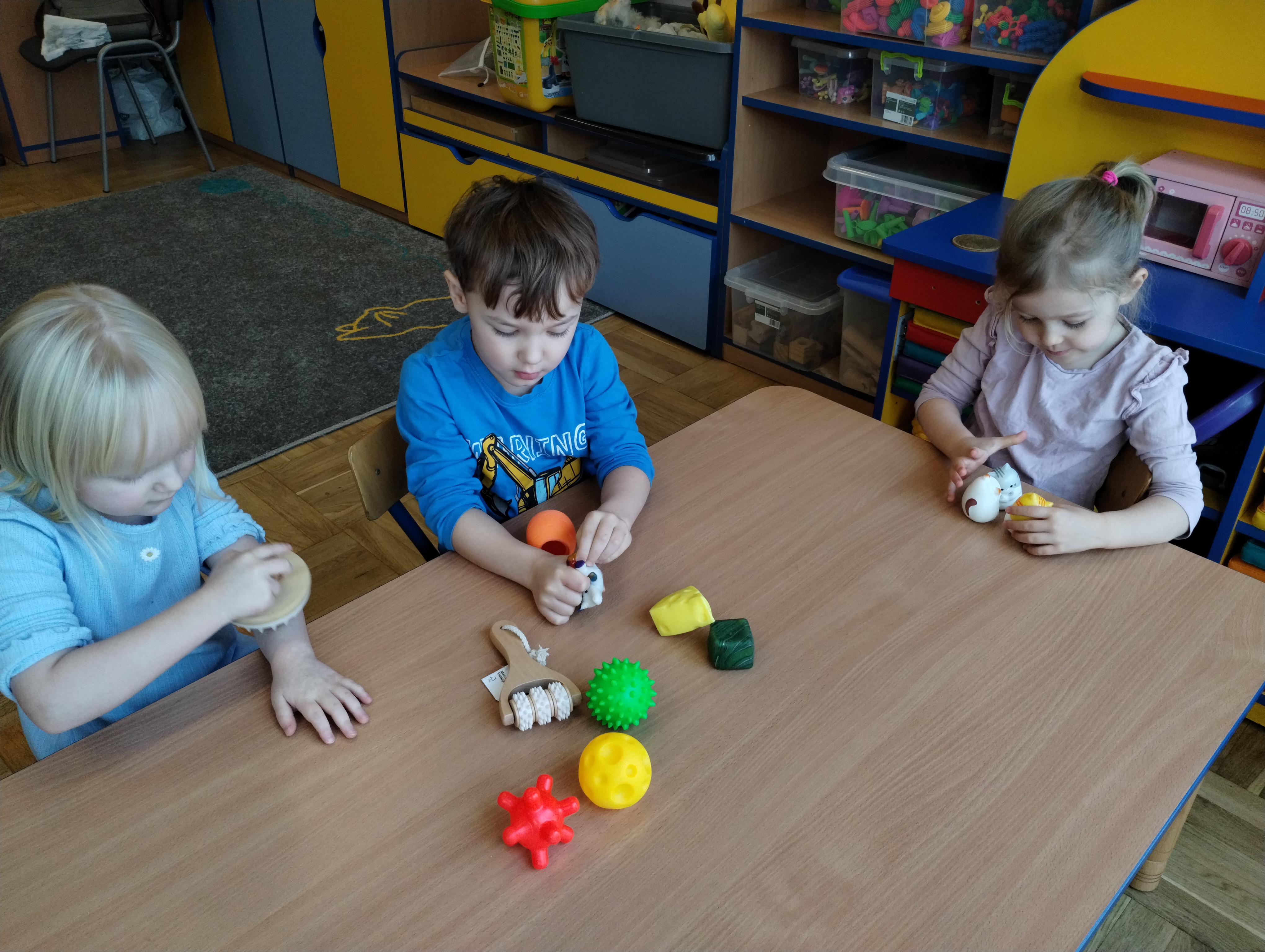 Terapia ręki w przedszkolu ma za zadanie usprawnić motorykę dziecka, w szczególności motorykę małą. Podczas zajęć dzieci z grupy Świetliki mogły wykonać sobie masaż rąk różnymi fakturami, wycinały także linie proste nożyczkami a na sam koniec bawiły się cieczą newtonowską. Dzień był pełen wrażeń i niesamowitych doświadczeń.