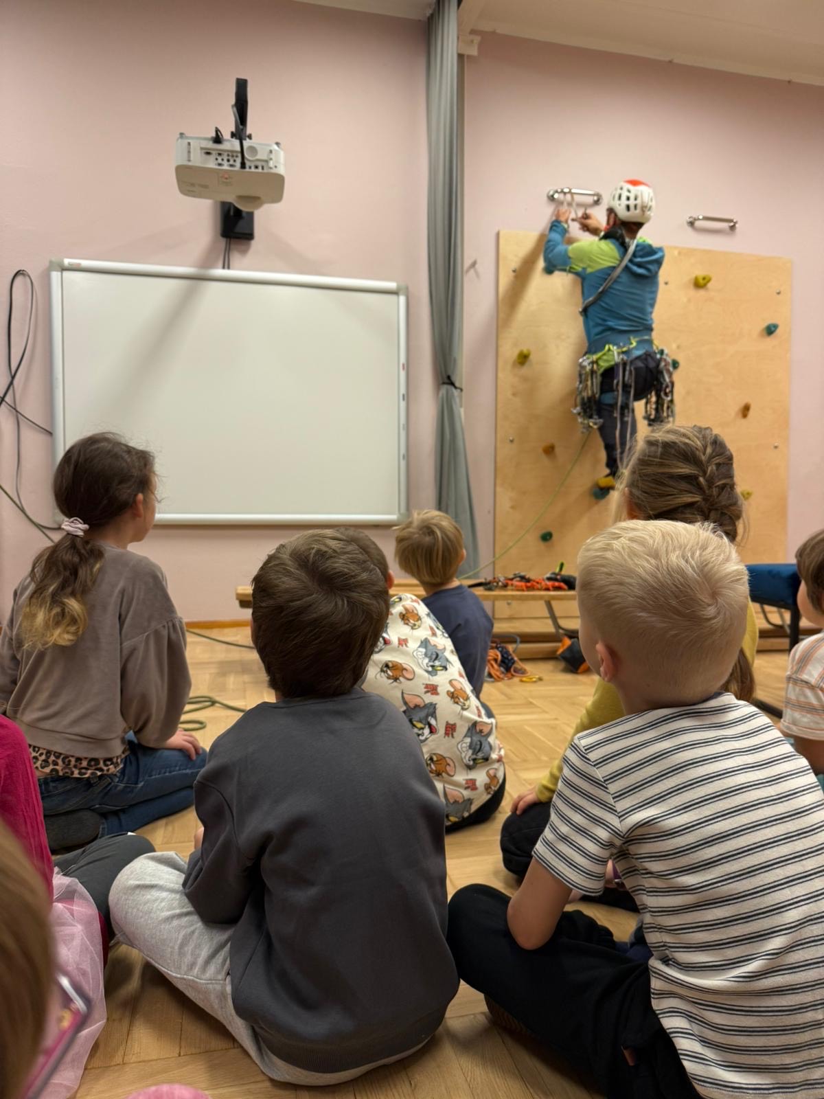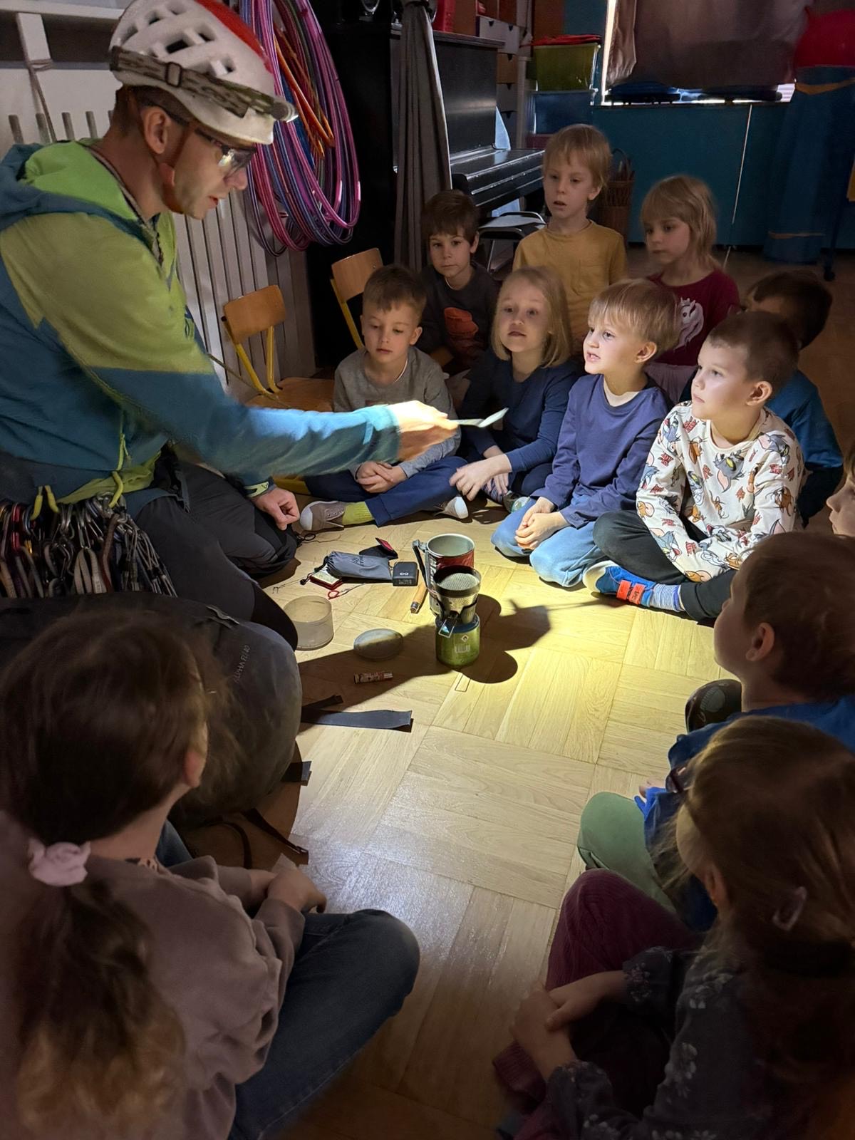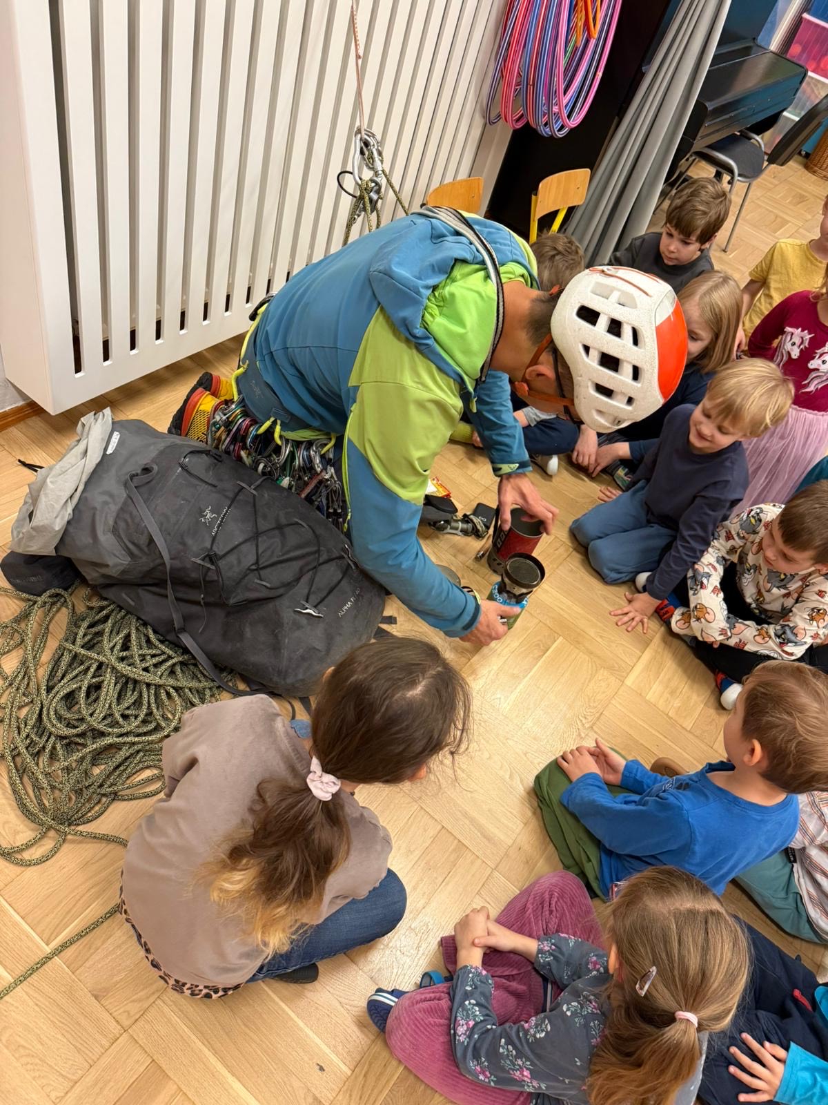 Dzieci miały okazję zobaczyć bez czego pan Tomek nie wybiera się na najwyższe szczyty. Poznały kilka zwrotów jakimi posługują się alpiniści w górach oraz jak zadbać o podstawowe potrzeby w tak trudnych warunkach. To była bardzo ekscytująca prezentacja, dziękujemy!